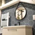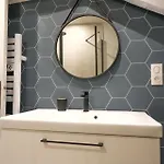 Ce logement comprend une salle de bains avec une douche à l'italienne, une toilette séparée et une machine à laver. Un sèche-cheveux et des draps de bain sont fournis pour le confort des clients.
